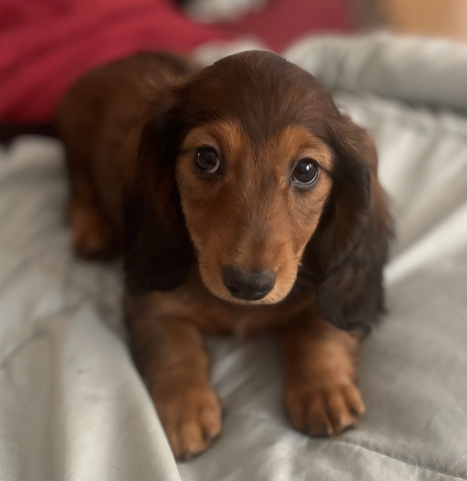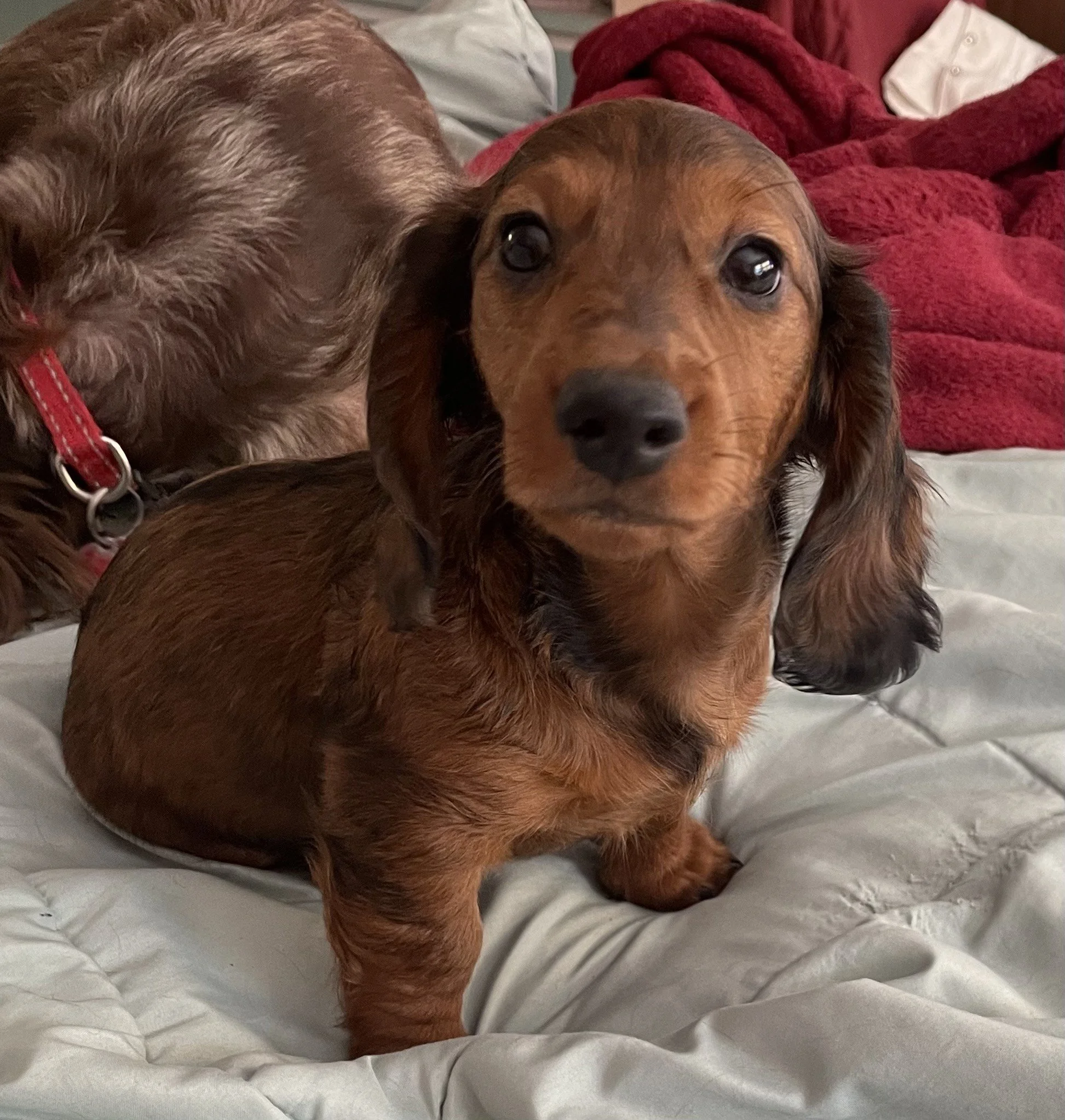 Luke has ancestors from Germany and boasts many champions in his bloodline. He is a first-generation dog born in the United States and is registered with the Deutscher Teckelklub 1888 e.V., as well as the APR (American Pet Registry) and the ACA (American Canine Association). Luke is a red with a black overlay. He is highly active and extremely inquisitive.